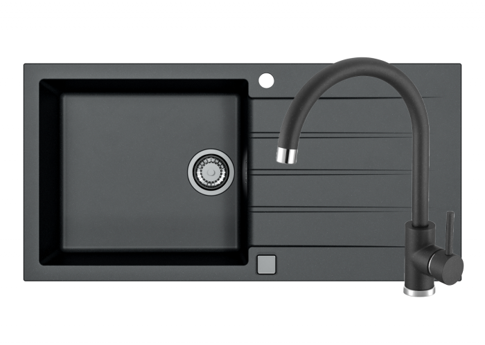 Pachet Alveus Cadit 50  si baterie Jana    Alveus Cadit 50   este o chiuveta de bucatarie realizata din material compozit, granital. Este formata dintr-o cuva spatioasa, prevazuta cu picurator si are dimensiunea totala de 100 x 50 cm.  Acest model de chiuveta Alveus este conceput pentru montajul pe blatul de bucatarie (incastrabil), fiind parte continua a suprafetei de lucru.  Culorile disponibile sunt alb,bej,gri,negru, ce ofera un contrast placut bucatariei dumneavoastra.  Chiuveta   Alveus Cadit 50  are o forma dreptunghiulara, cu dimensiunea cuvei de 47.5 x 42.5 x 19.8 cm , potrivita pentru spalarea vaselor de orice dimensiune. Aceasta chiuveta este confectionata dintr-un amestec compozit de calitate superioara, numit granital. Datorita procesarii atente a materialului, suprafata chiuvetei de bucatarie este neteda, placuta la atingere si permite o curatare usoara. In plus, ii ofera si alte avantaje, cum ar fi: rezistenta la temperaturi inalte, la utilizare intensa, rezistenta maxima la socuri termice si mecanice, nu se fisureaza si nu se zgarie.   Chiuveta vine insotita cu urmatoarele accesorii:   sifon cu pop up;  ventil de 3 1 2  ;  sistem de prindere.  Alveus Jana   este o baterie pentru chiuvetele de bucatarie, ce dispune de un design elegant, ce se potriveste atat in bucatariile traditionale, precum si in cele moderne, completand functional spatiul in care gatiti si serviti masa. Aceasta este realizata din material   alama   si este disponibila in culorile alb,bej,gri,negru.  Bateria are robinet de tip   monocomanda   si   cartus ceramic   ce  asigura o functionare fiabila  si durata lunga de viata;  pipa este   inalta   si mobila (cu rotatie 360 º), astfel incat sa se adapteze nevoilor dumneavoastra.  Dimensiunile acesteia sunt: 20.3 cm latime si 34 cm inaltime. Aceasta baterie Alveus poate fi montata pe chiuveta sau pe blatul de bucatarie si vine insotita de sistem prindere si racorduri flexibile.  Intretinere:    curatati componentele in mod regulat, pentru a preveni acumularea de murdarie. Curatarea bateriei se va realiza doar cu un detergent neutru, neabraziv. Clatiti componentele cu apa si stergeti-le cu o carpa moale.